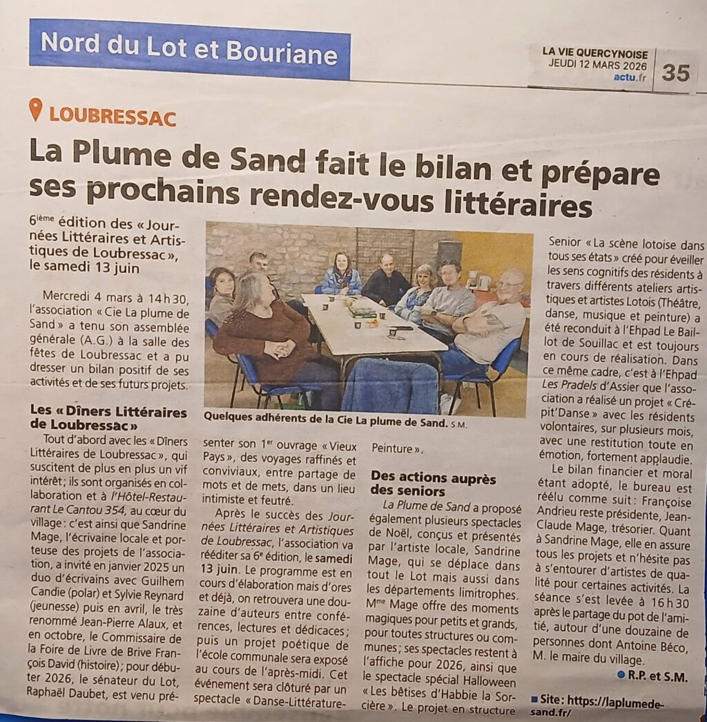 L’AG de La Cie La plume de Sand a eu lieu le mercredi 4 mars à 14h30, à la salle des fêtes de Loubressac. Le bilan des activités est bien positif[…]