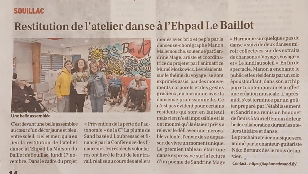 Le projet « Crépit’Danse » s’est déroulé avec succès le mardi 25 novembre à l’EHPAD Les Pradels d’Assier, devant une belle assemblée réunissant les familles, la Direction, Monsieur le Maire ainsi que des représentants de l’ARS. Les résidents volontaires, guidés par la danseuse et chorégraphe Marie Arsandaux, accompagnée de Sandrine Mage, artiste et coordinatrice du…