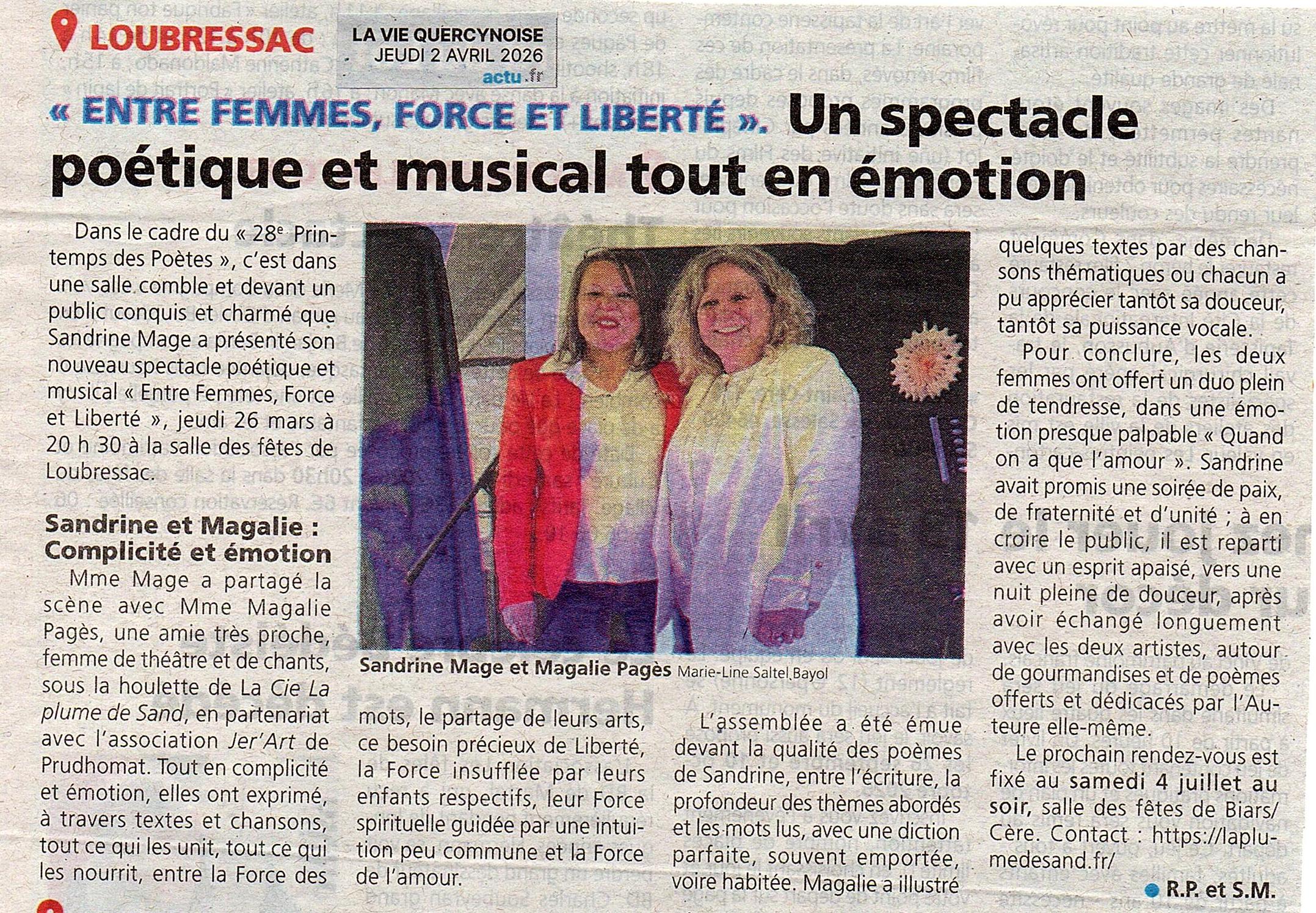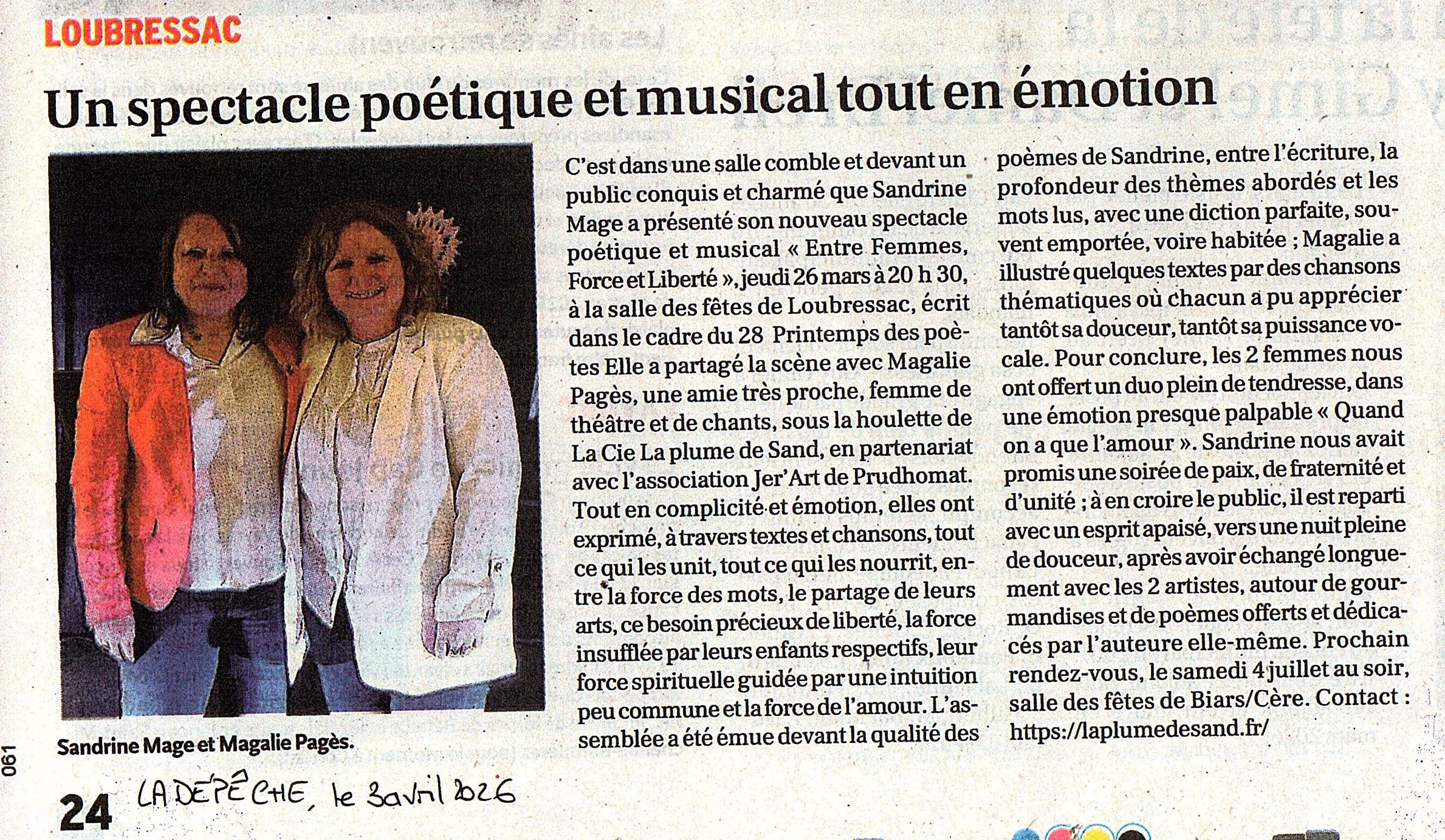 Une soirée tout en émotion pour la Première du nouveau spectacle poétique et musical de Sandrine Mage intitulé « Entre Femmes, Force et Liberté » joué devant plus de 40 personnes dans la salle des fêtes de Loubressac, jeudi 26 mars.  2 femmes, 2 amies, 2 complicités, entre lectures et chansons thématiques interprétées par Magalie Pagès, avant un duo tout en tendresse qui a ému toute l’assemblée.