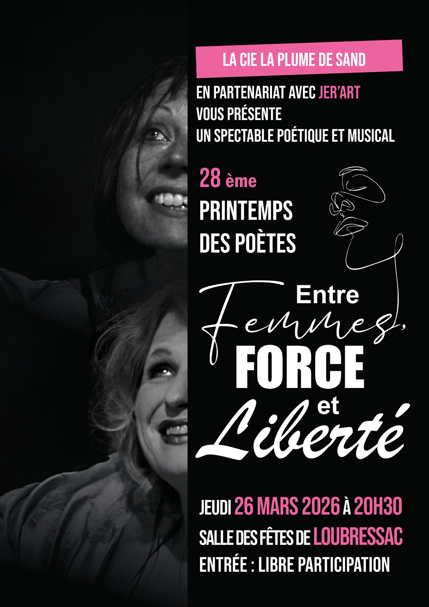 La Cie La plume de Sand en partenariat avec l’association JER’Art, vous propose, dans le cadre du 28è Printemps des Poètes, dont le thème national est « Liberté. Force vive déployée », un spectacle poétique et musical de Sandrine Mage « Entre Femmes, Force et Liberté ». JEUDI 26 MARS 20h30, salle des fêtes de Loubressac.